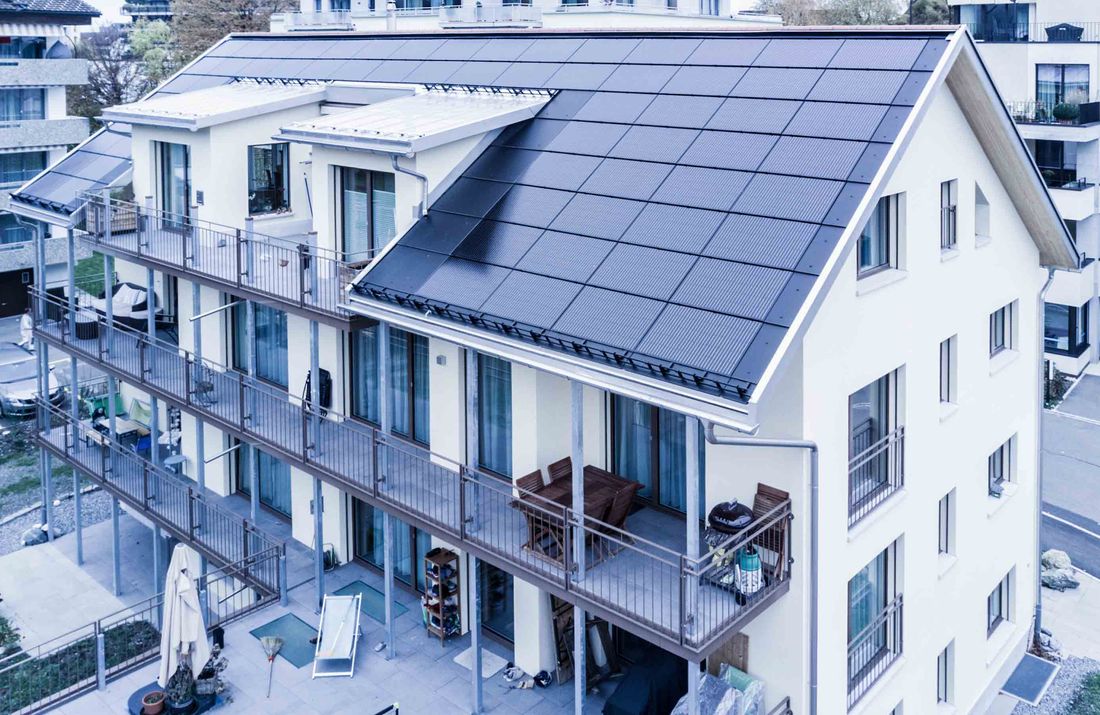 Die Indachanlage auf dem Schrägdach des Mehrfamilienhauses ist ein beeindruckendes Beispiel für nachhaltige Energiegewinnung und zeigt eindrucksvoll, wie moderne Technologie effektiv zur Umweltfreundlichkeit beitragen kann. Diese Anlage ist nicht nur ein technisches Meisterwerk, sondern auch ein Symbol für den Fortschritt in der Nutzung erneuerbarer Energien. Mit einer installierten Leistung von 12,54 Kilowattpeak, die es ermöglicht, eine erhebliche Menge an Energie zu erzeugen, und insgesamt 66 Solarpanels, die strategisch auf einer Fläche von 70 Quadratmetern in Südausrichtung platziert sind, ist diese Anlage optimal positioniert. Die sorgfältige Planung und Ausrichtung maximiert die Sonneneinstrahlung und sorgt dafür, dass die Solarpanels das ganze Jahr über effizient arbeiten können, um eine beeindruckende Energieproduktion von 12'540 kWh pro Jahr zu erreichen. Diese innovative Lösung ist ein Paradebeispiel dafür, wie Privatpersonen in Freienbach aktiv zur Reduzierung ihres CO2-Fussabdrucks beitragen können, indem sie auf erneuerbare Energien setzen. Durch die Nutzung der Sonnenenergie wird nicht nur der Bedarf an fossilen Brennstoffen verringert, sondern auch ein wichtiger Schritt in Richtung einer nachhaltigeren Zukunft gemacht. Diese Anlage zeigt, dass jeder Einzelne durch den Einsatz moderner Technologien und erneuerbarer Energien einen bedeutenden Beitrag zum Umweltschutz leisten kann. Sie ist ein leuchtendes Beispiel dafür, wie technologische Innovation und Umweltbewusstsein Hand in Hand gehen können, um eine bessere und grünere Welt zu schaffen.